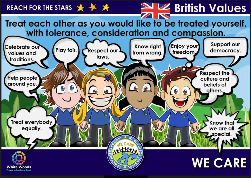- Visual Reminders: Posters, displays, and class messages highlight the British Values and the connections to our WE CARE ethos throughout the school environment.